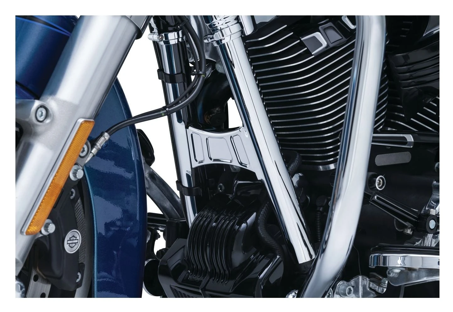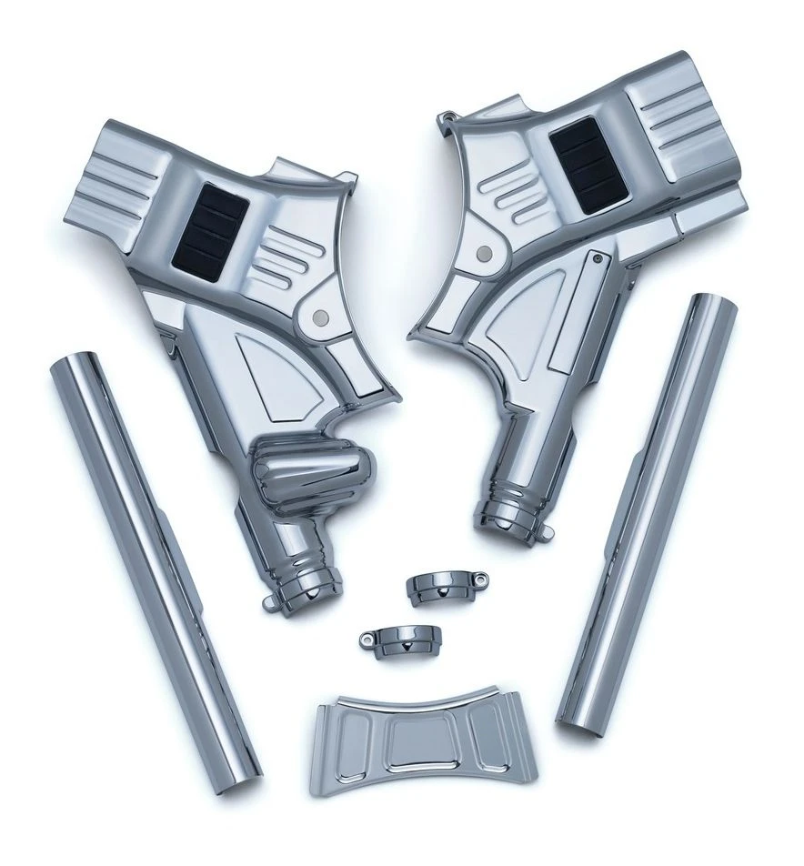 Just the right touch of edge and functionality. Hide those welds and wires in one quick and easy step. Kuryakyn neck cover kits customize the frame’s steering neck and down tubes with easily installed chrome covers.