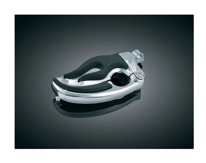 The flame design adds class and a timeless style to your bike. Designed with a flip-out arm for use as a heel rest that adds comfort on long rides and folds away when not needed. Features chrome bodies and rubber pad inserts that isolate the foot from vibration. The built-in curb-feeler hits the ground before your pegs do. The Flame pegs are available with late model H-D male-mount ends. Matching Shift Pegs and Brake Pedals also available separately.