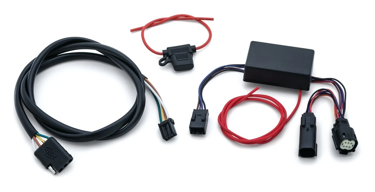 - Relay harness utilizes inputs from the motorcycle to direct power from the battery to the appropriate trailer lighting circuit
